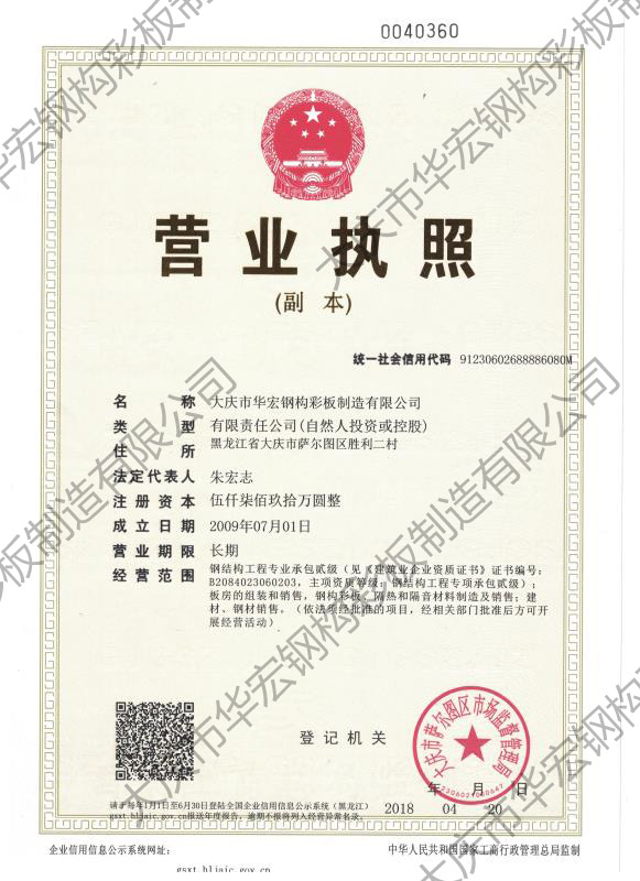 華宏鋼構(gòu)始建于2009年8月9日,總部位于大慶市薩爾圖區(qū)南一路13號(hào),現(xiàn)有大慶市華宏鋼構(gòu)彩板制造有限公司、黑龍江省華宏力安綠建科技有限公司、大慶市華宏鋼構(gòu)彩板制造有限公司長(zhǎng)春分公司、黑龍江省海森新材料科技有限公司、大慶市瑞和通螺栓廠五家工業(yè)企業(yè)形成了以彩板復(fù)合板、裝配式鋼結(jié)構(gòu)建筑、保溫材料、配件制造為主的五大生產(chǎn)基地,占地總面積 20余萬平方米,生產(chǎn)車間5萬平方米。中高層管理干部26 人,高級(jí)工程師9人,各類國(guó)家注冊(cè)執(zhí)業(yè)人員 32 人,車間技工 260人,專業(yè)安裝隊(duì)伍 10 余支,帶動(dòng)就業(yè) 500